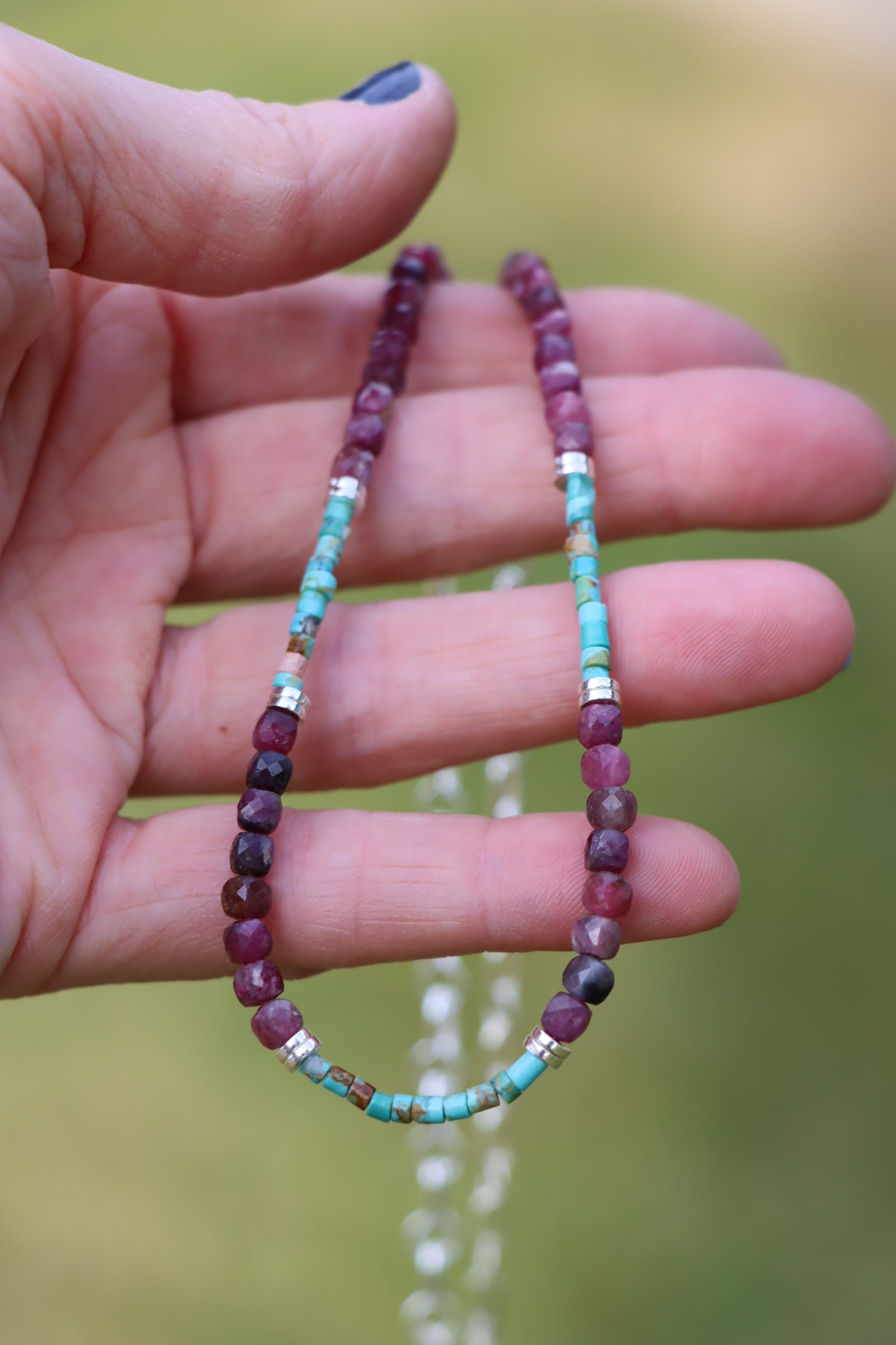 A strand of hand-selected tourmaline + turquoise stones, finished with sterling silver accents. Earthy, bright, and easy to wear—this necklace layers beautifully or stands on its own as a colorful everyday piece.