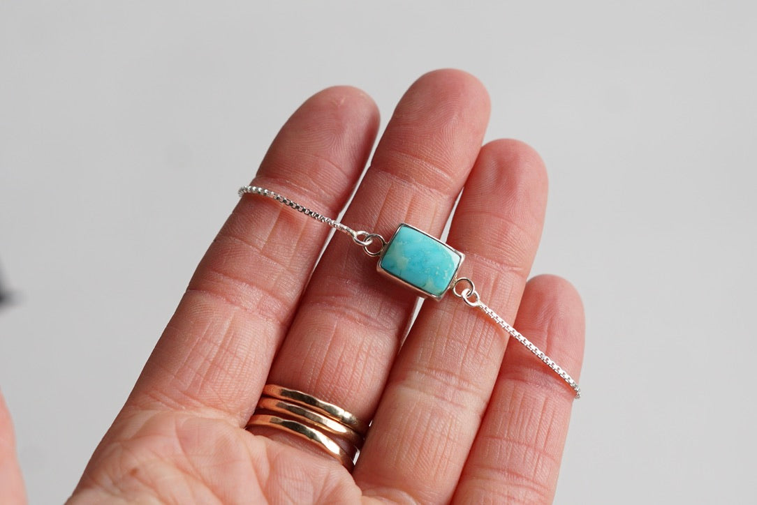 This bracelet is fully adjustable using a movable bead that slides along the chain until it fits to your wrist just right. It's anchored by a beautiful Kingman stone set in sterling silver. One size only.