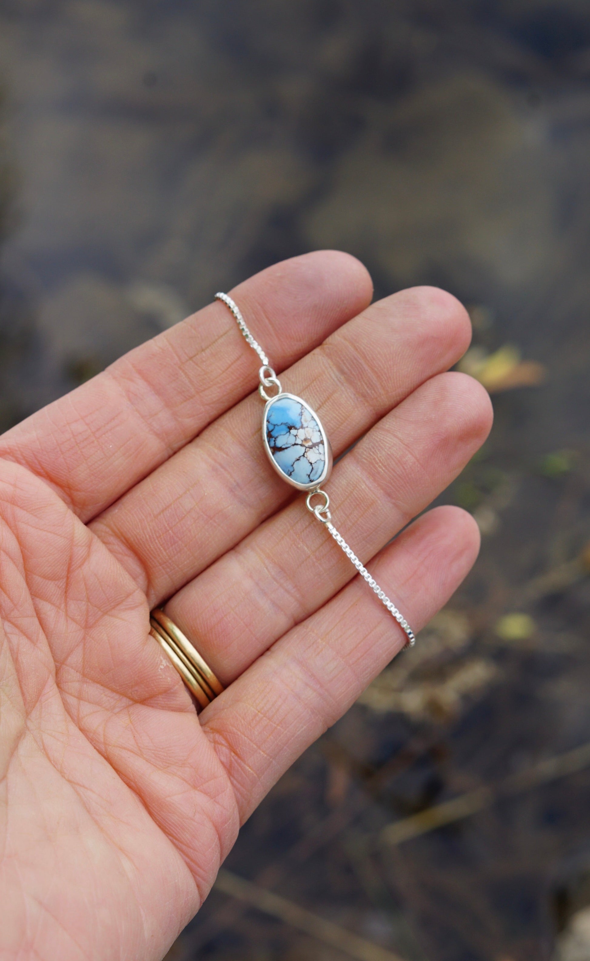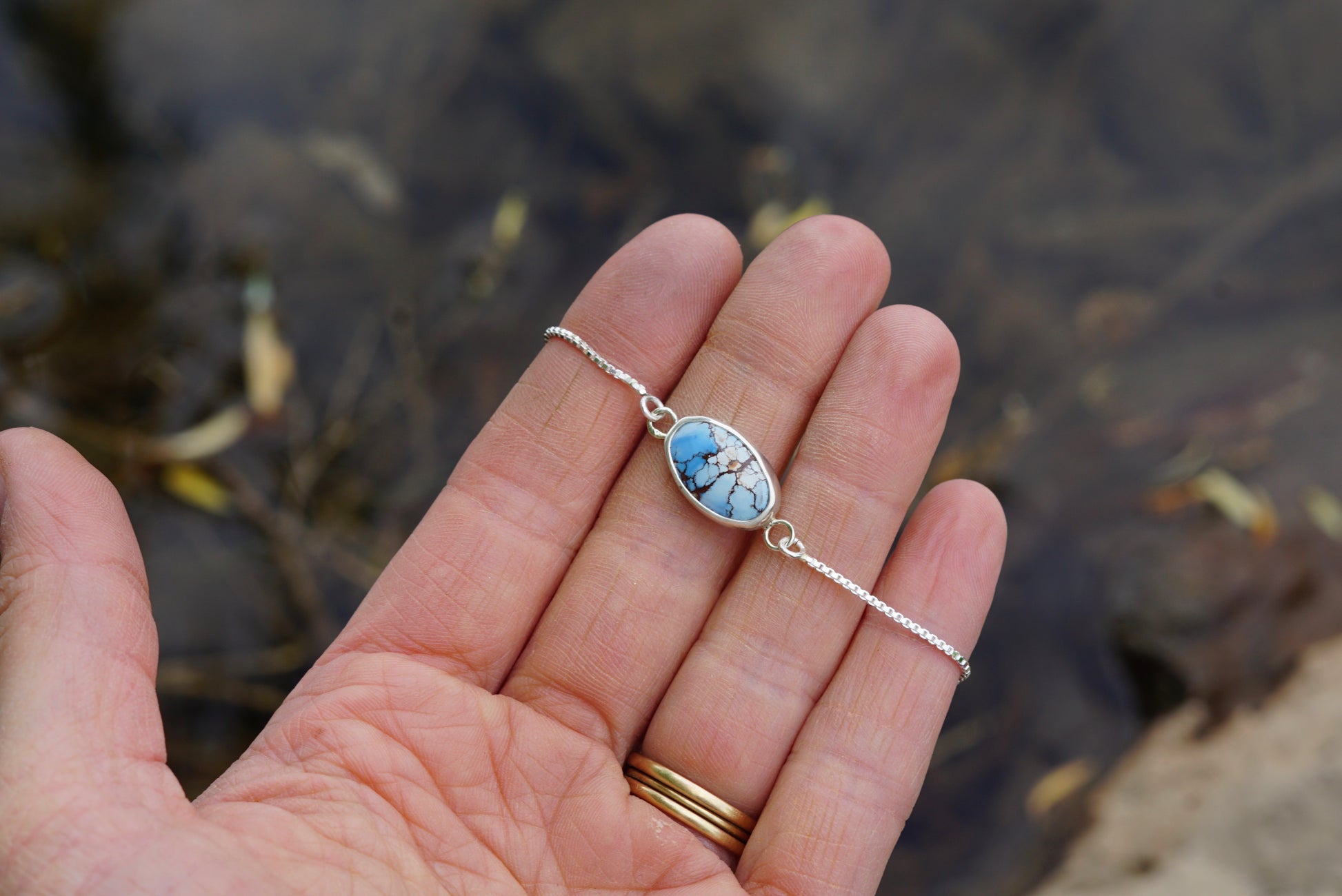 This bracelet is fully adjustable using a movable bead that slides along the chain until it fits to your wrist just right. It's anchored by a beautiful stone set in sterling silver.