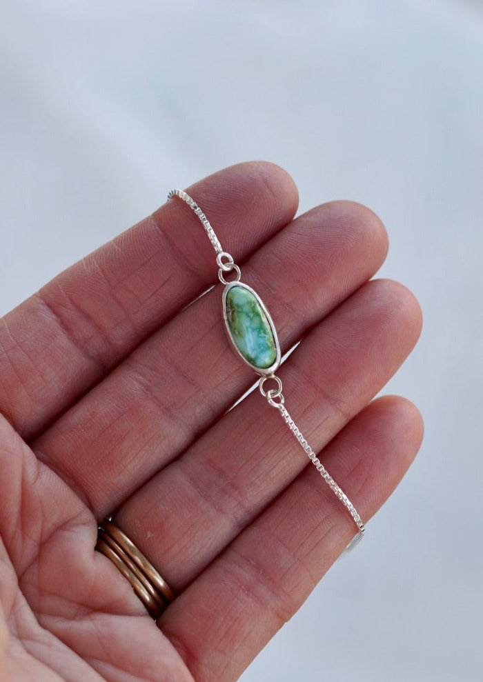 This bracelet is fully adjustable using a movable bead that slides along the chain until it fits to your wrist just right. It's anchored by a beautiful stone set in sterling silver.