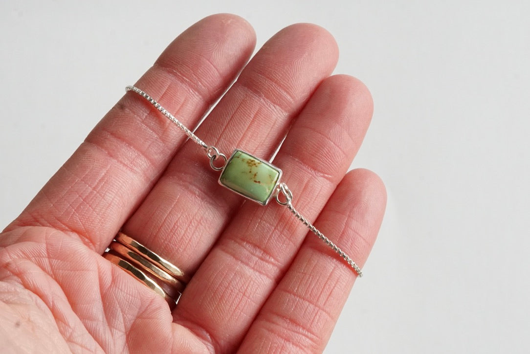 This bracelet is fully adjustable using a movable bead that slides along the chain until it fits to your wrist just right. It's anchored by a beautiful Sonoran Gold stone set in sterling silver. One size only.