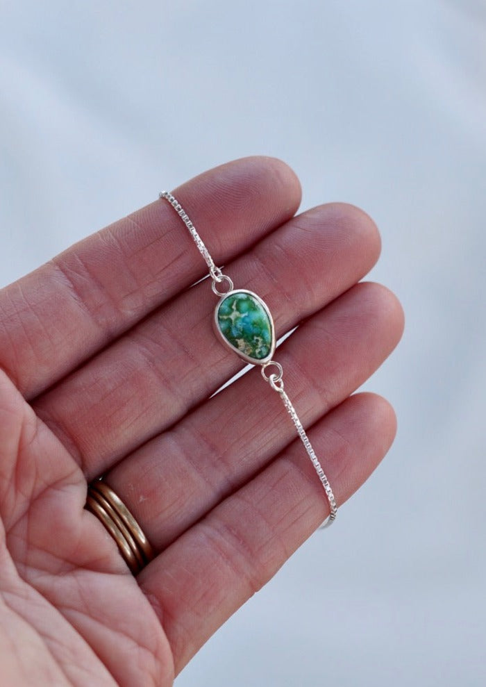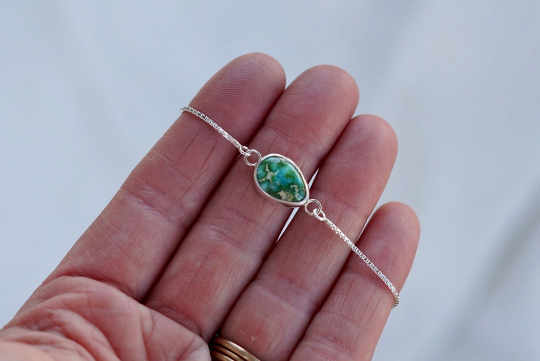 This bracelet is fully adjustable using a movable bead that slides along the chain until it fits to your wrist just right. It's anchored by a beautiful stone set in sterling silver.