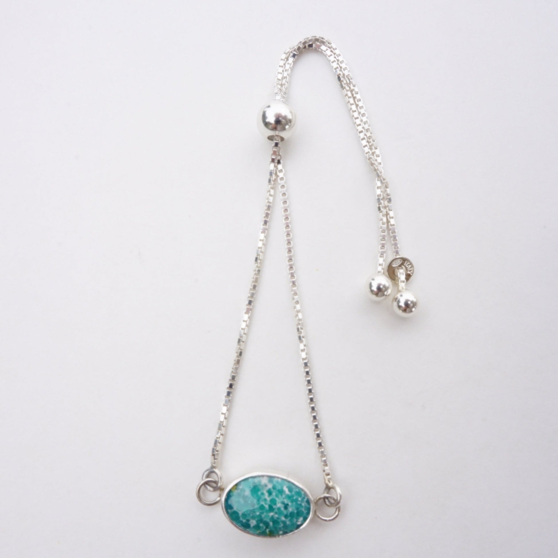 This bracelet is fully adjustable using a movable bead that slides along the chain until it fits to your wrist just right. It's anchored by a beautiful White Water Turquoise stone set in sterling silver. One size only.