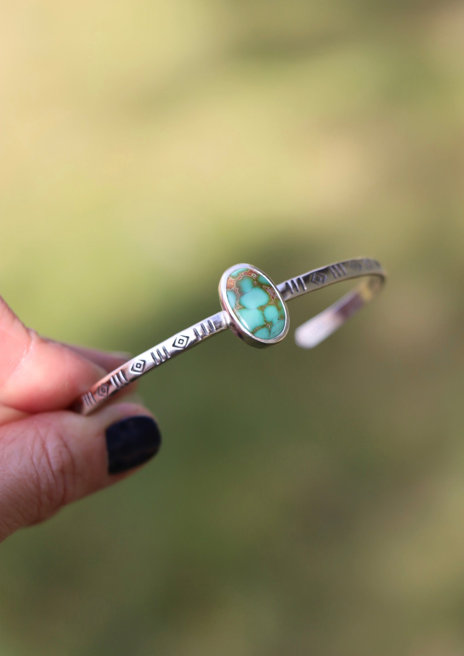Sterling silver cuff bracelet with a hand stamped pattern. This cuff features one high quality Sonoran Gold Turquoise stone.