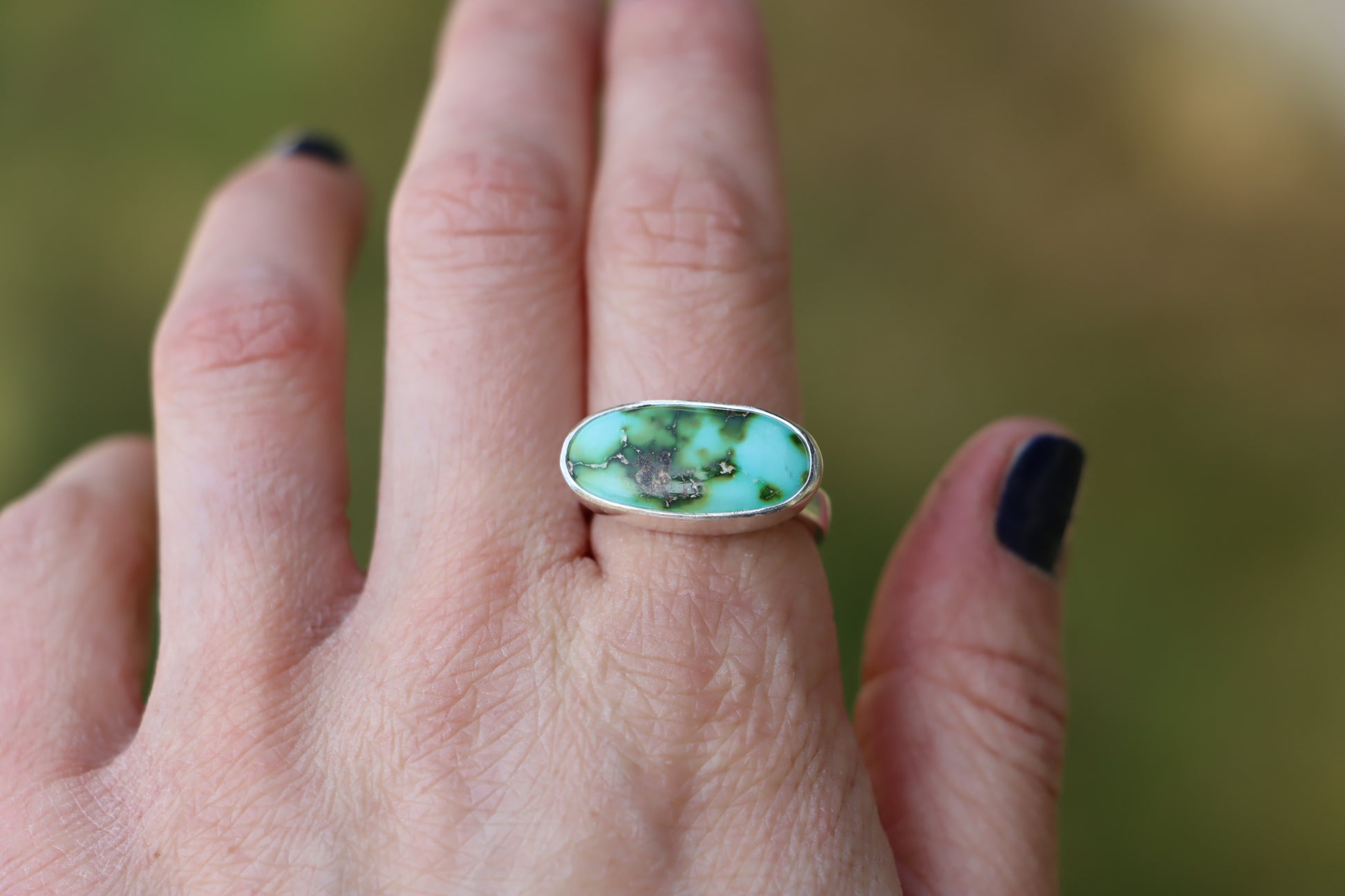 This listing features one beautiful horizontally set Sonoran Gold stone. It is made entirely from sterling silver and sits on top of a simple ring band.