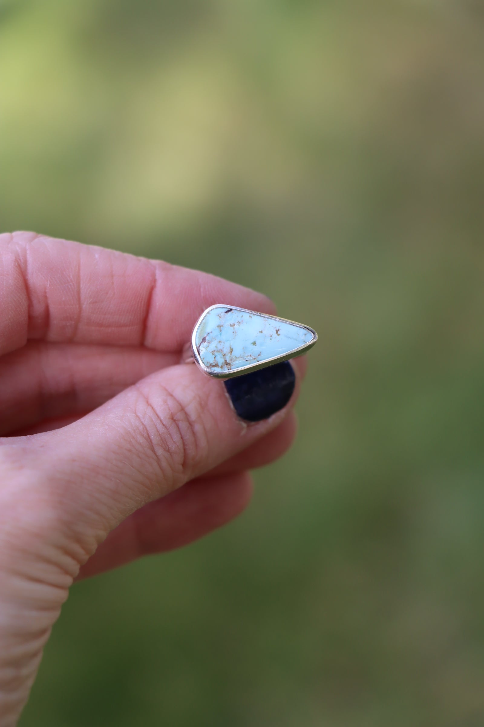 This listing features one beautiful horizontally set Dry Creek stone. It is made entirely from sterling silver and sits on top of a simple ring band.