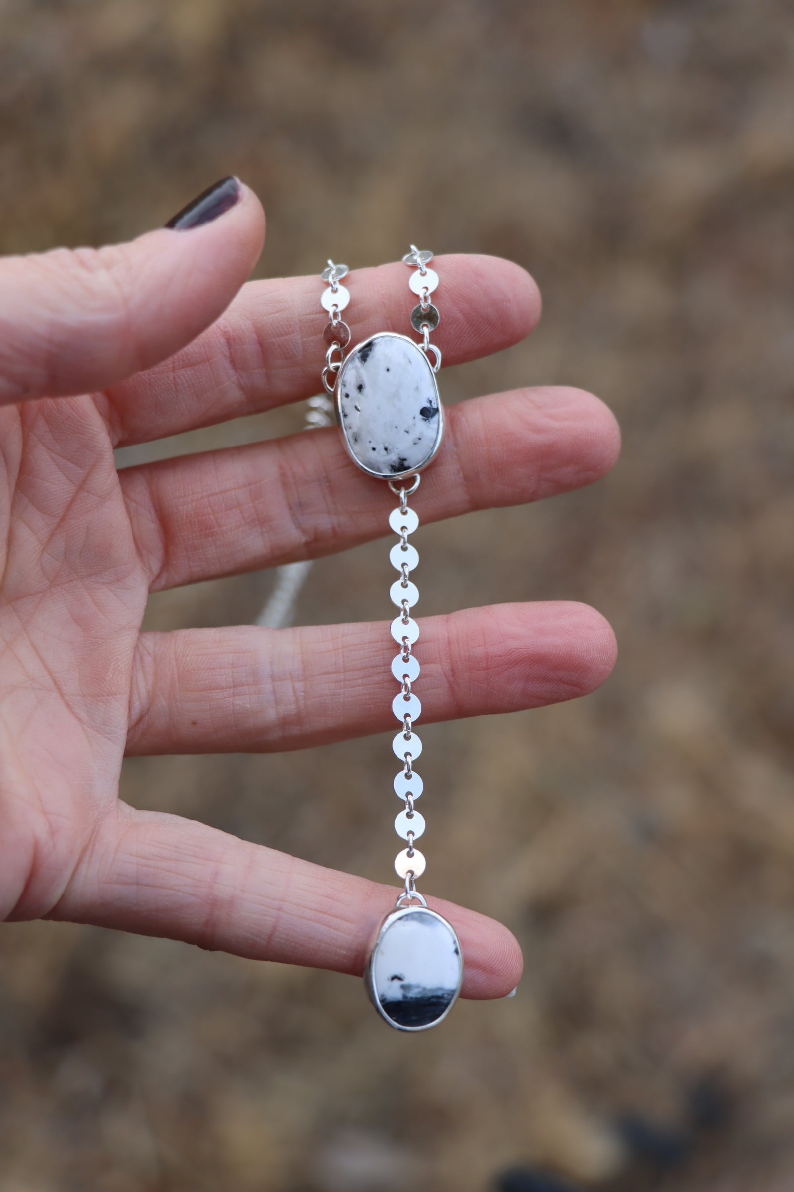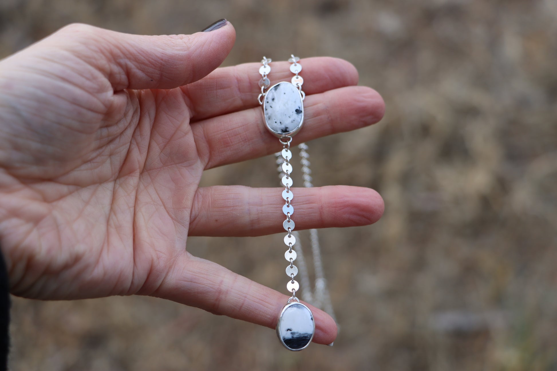 The necklace and top stone hangs at 18''. The additional stone hangs an extra 3''.