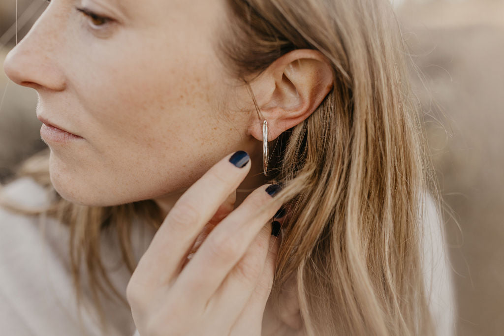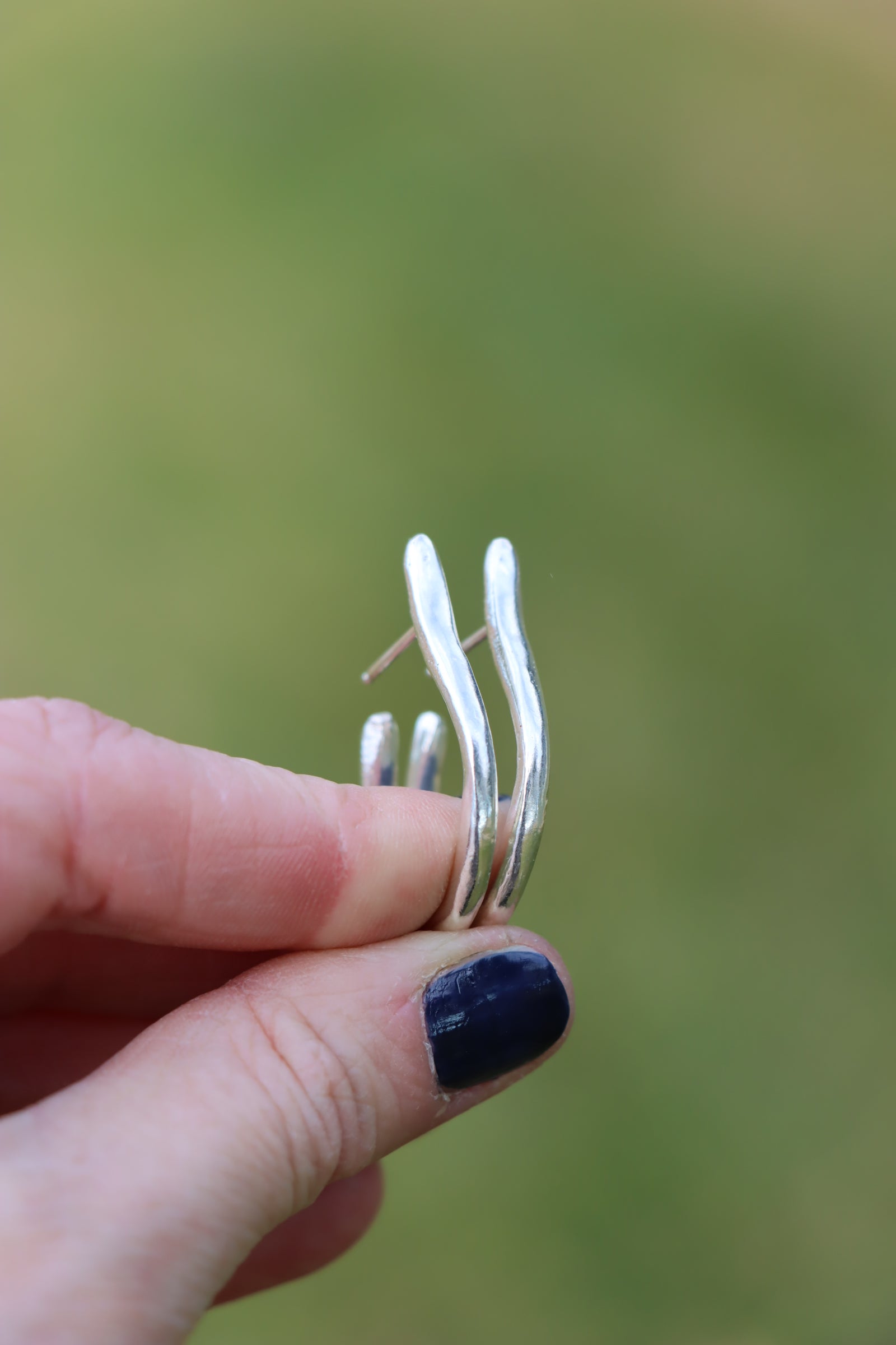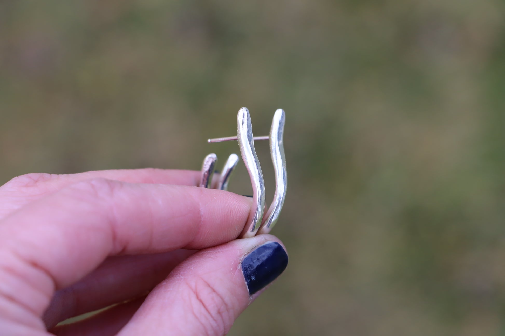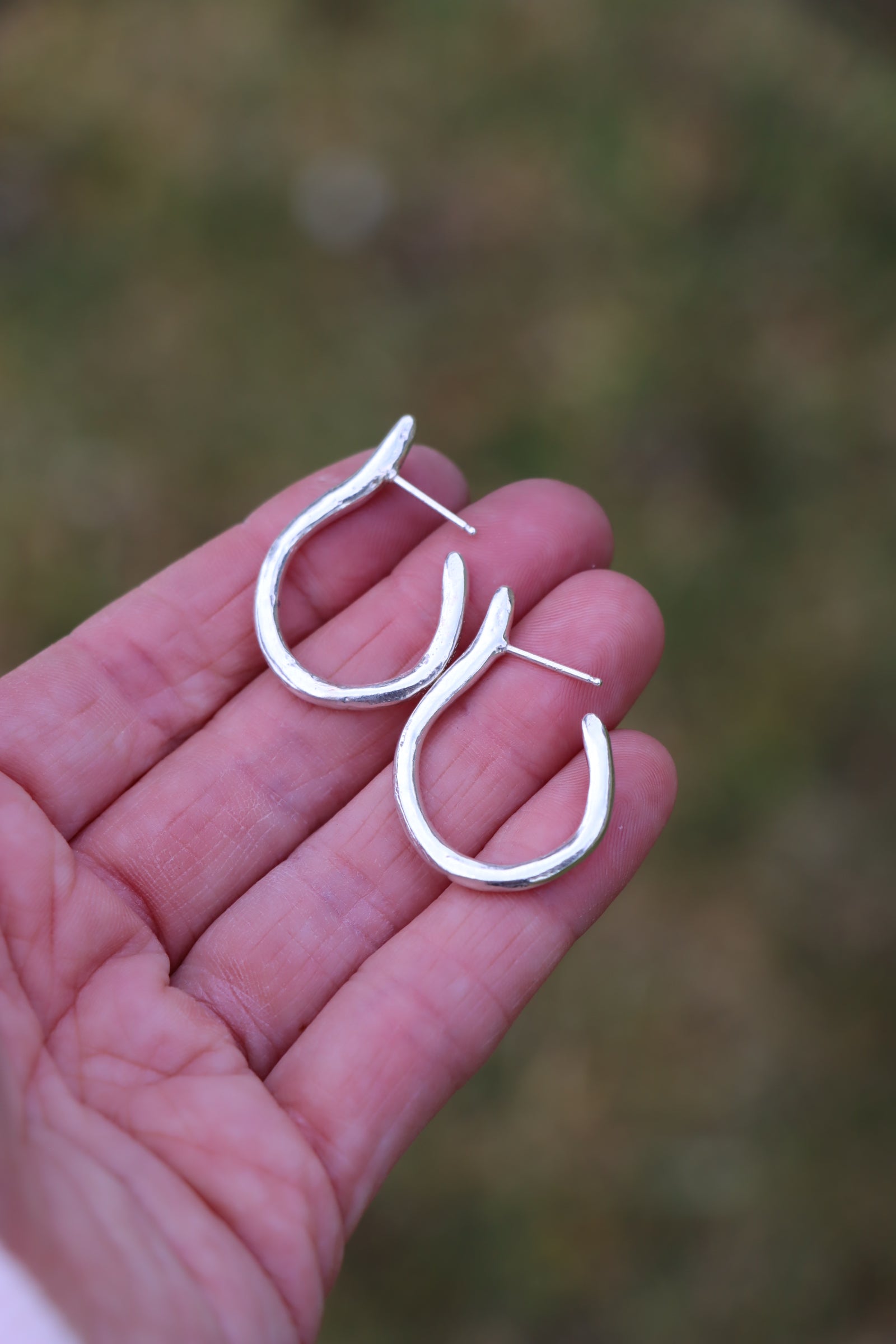 Sand cast in sterling silver, these open hoops feature an organic, free-form shape shaped by hand and finished to a soft shine. Each pair carries subtle variations from the casting process, making them truly one of a kind and easy to wear every day.