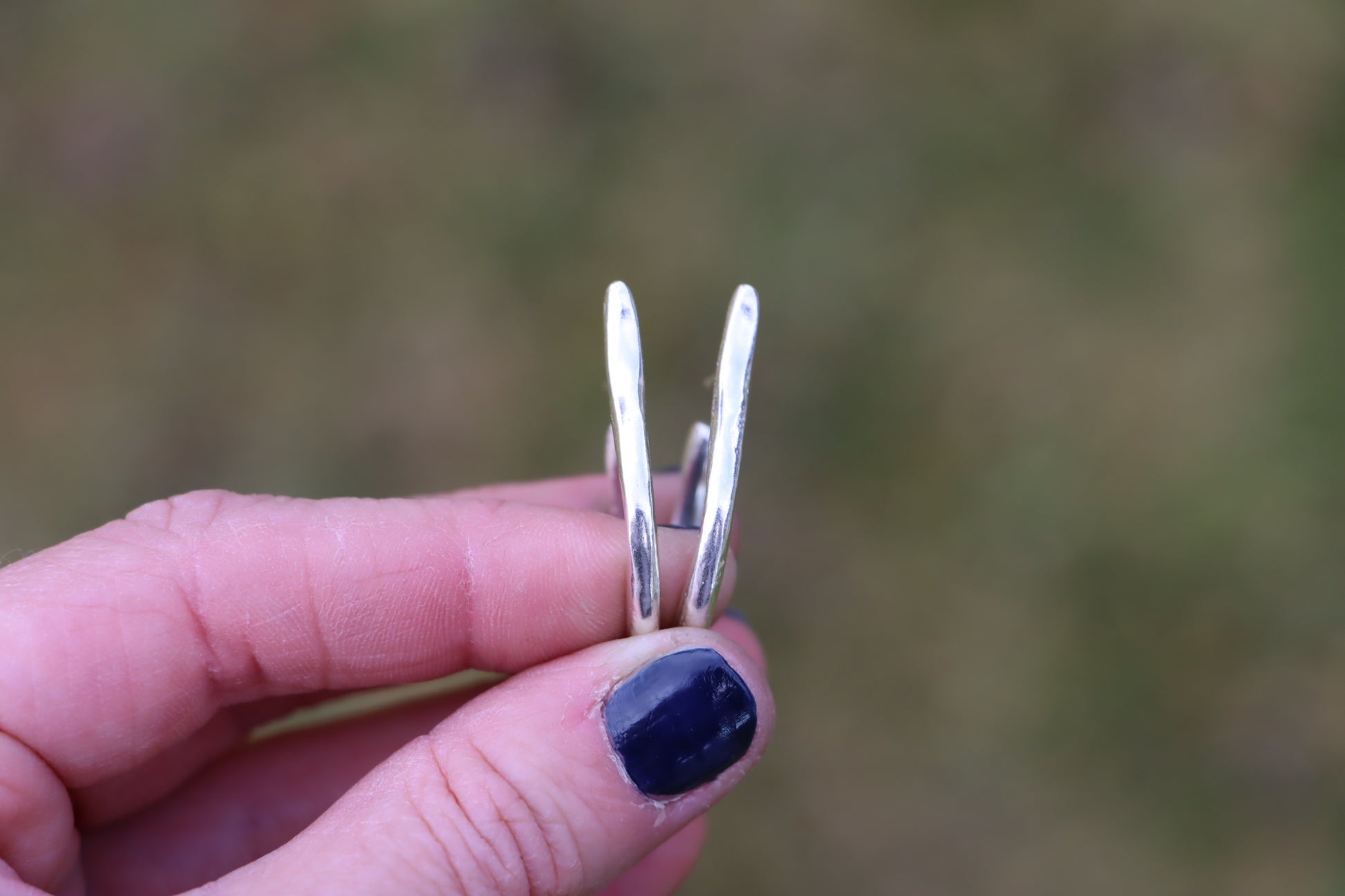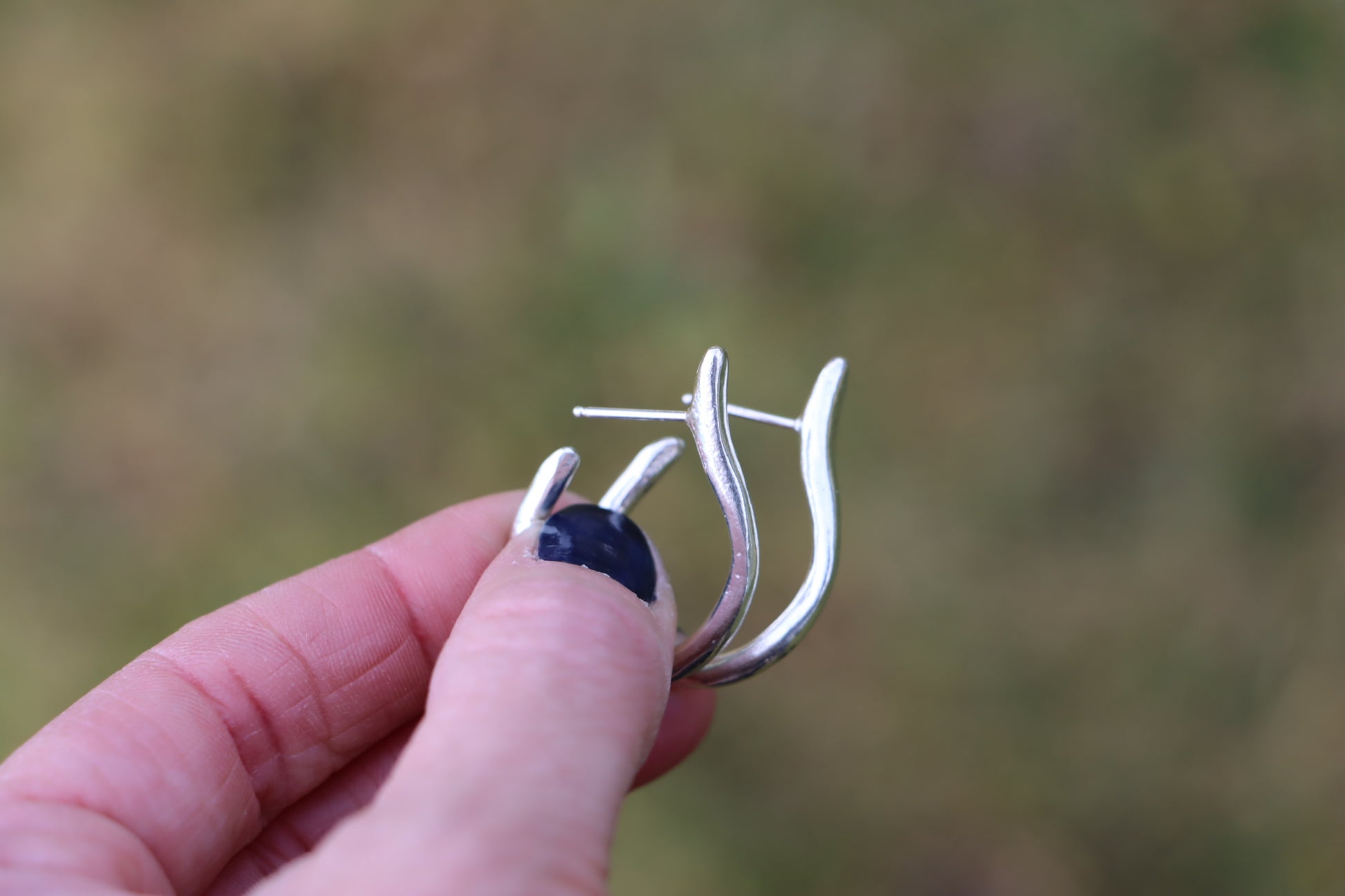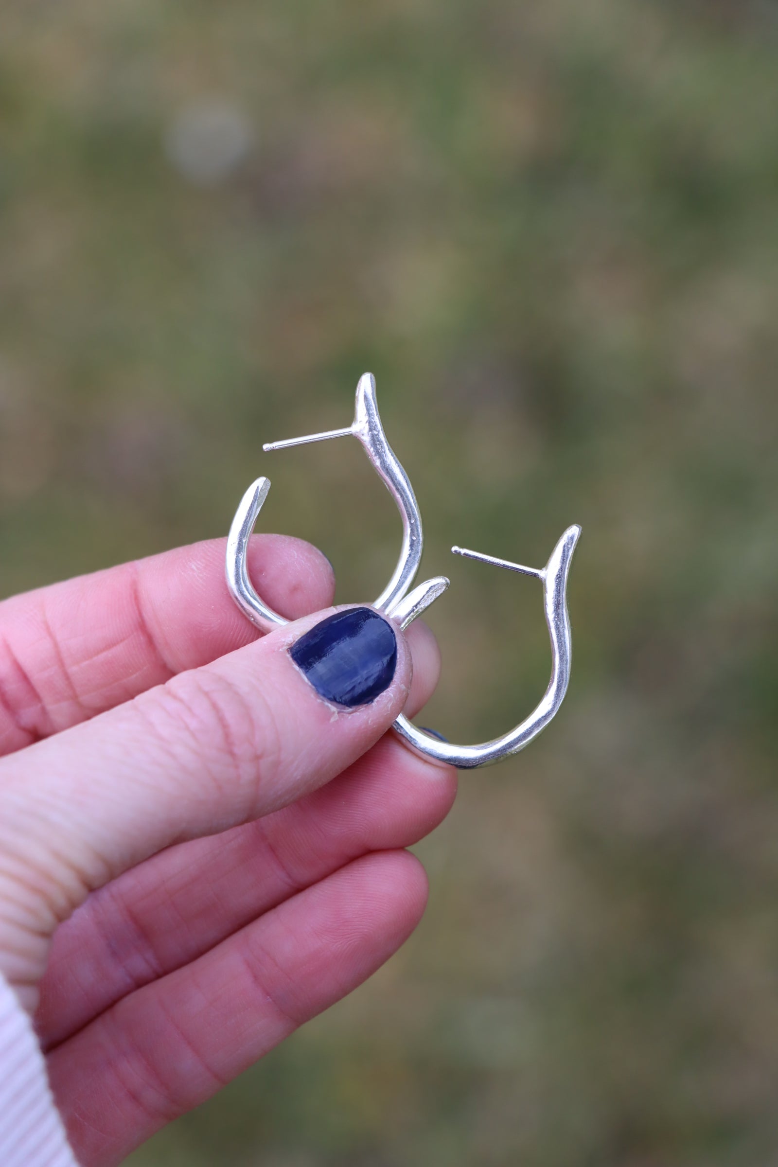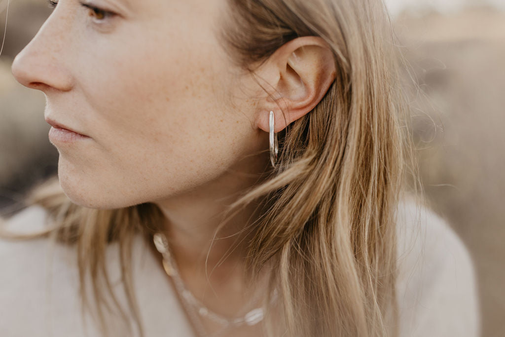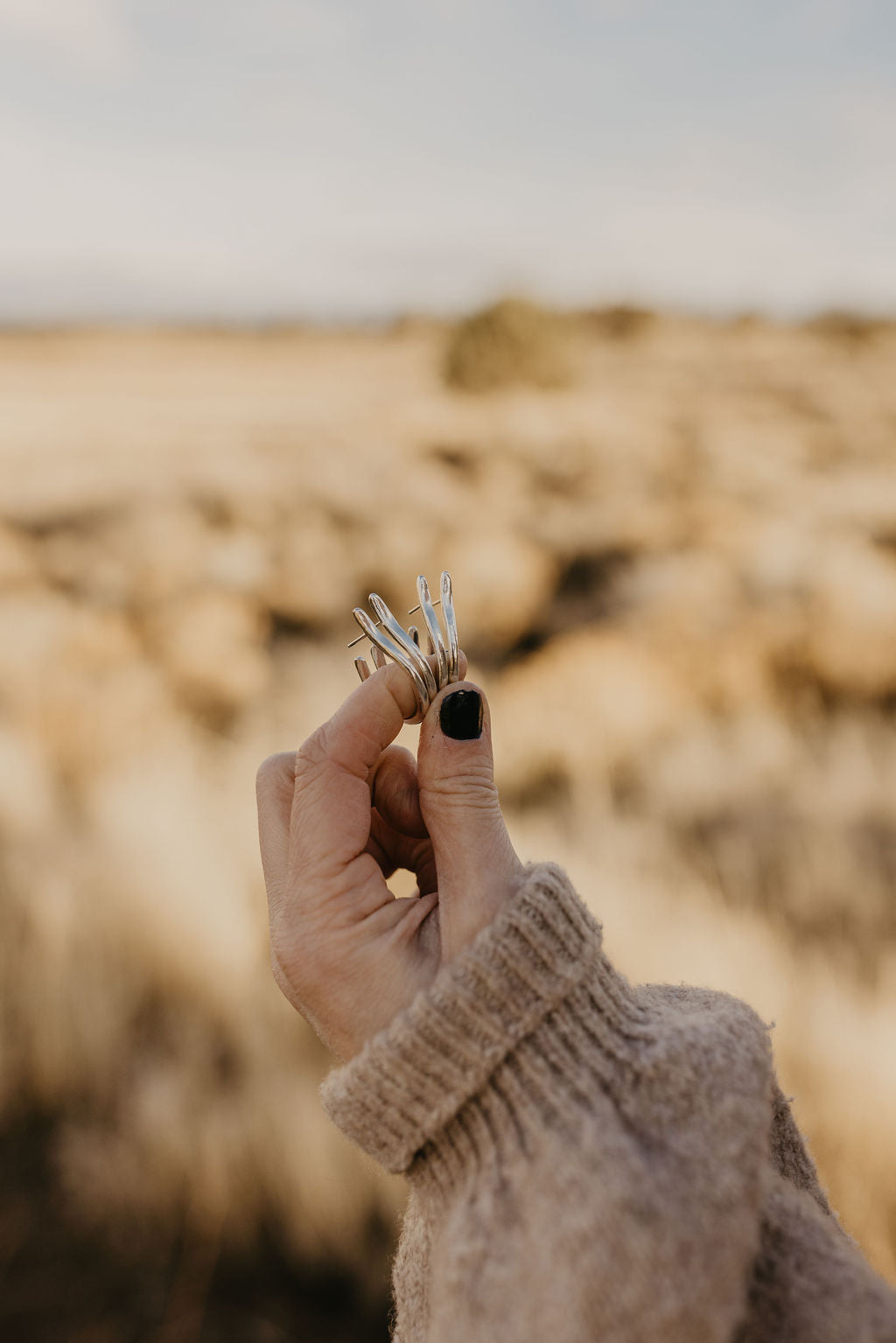 Sand cast in sterling silver, these open hoops feature an organic, free-form shape shaped by hand and finished to a soft shine. Each pair carries subtle variations from the casting process, making them truly one of a kind and easy to wear every day.
