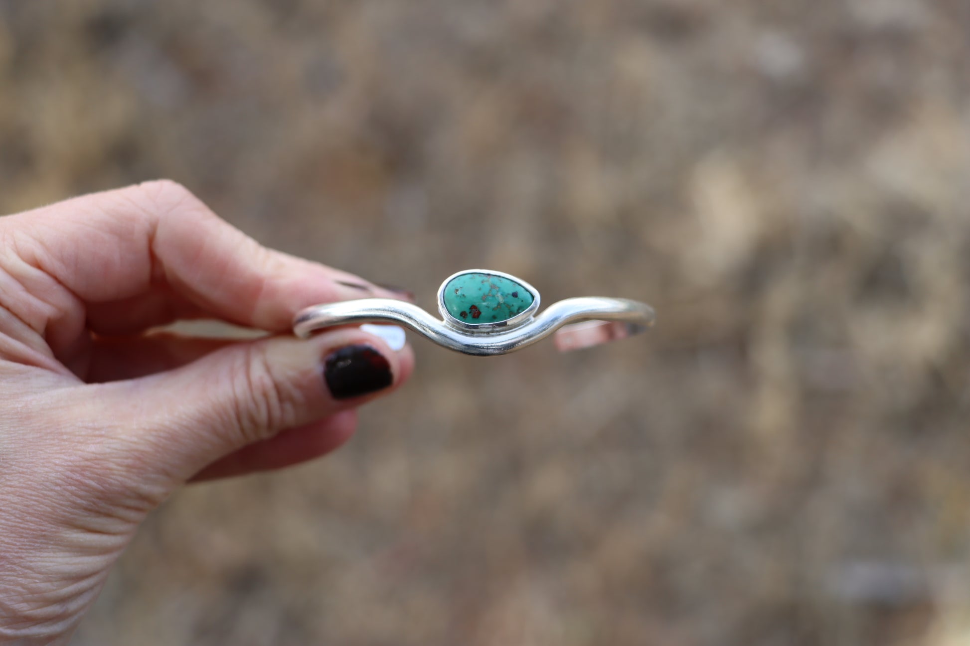 Hand-forged from sterling silver, this cuff features a flowing wave design that cradles a one-of-a-kind Carico Lake stone. The soft curve gives it an organic, easy-wearing feel, while the bold silver frame adds structure and strength. Each stone was handpicked for its color and matrix, making every cuff truly unique.