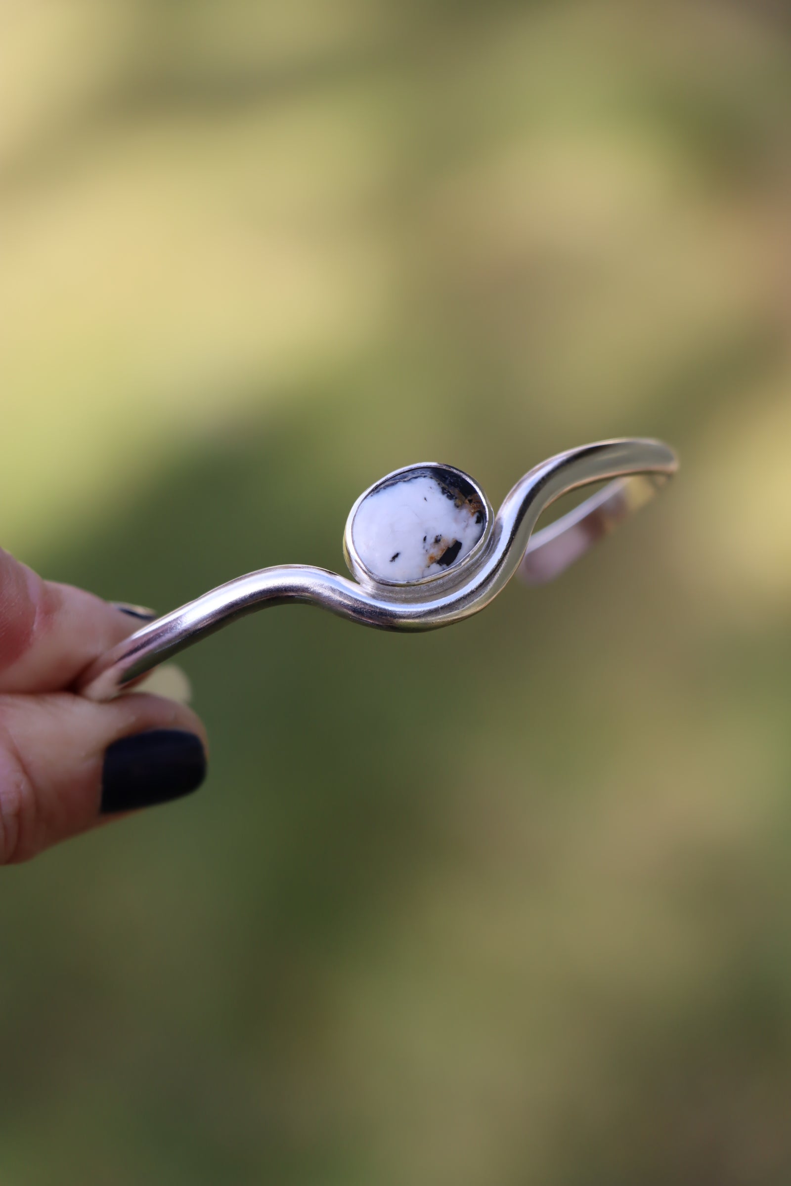 Hand-forged from sterling silver, this cuff features a flowing wave design that cradles a one-of-a-kind Turquoise Mountain stone. The soft curve gives it an organic, easy-wearing feel, while the bold silver frame adds structure and strength. Each stone was handpicked for its color and matrix, making every cuff truly unique.