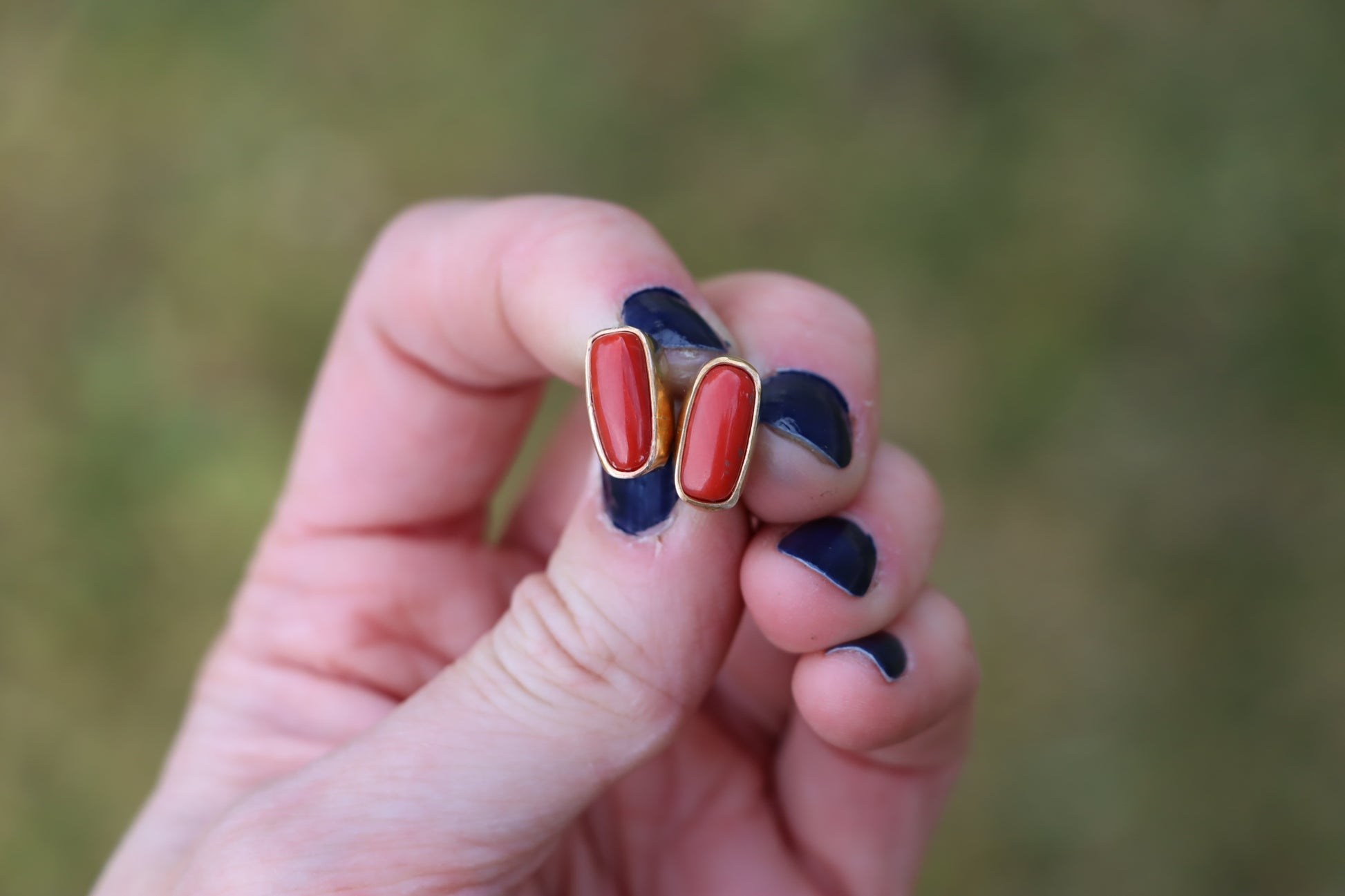 This listing features one pair of Gold-fill and coral stud earrings
