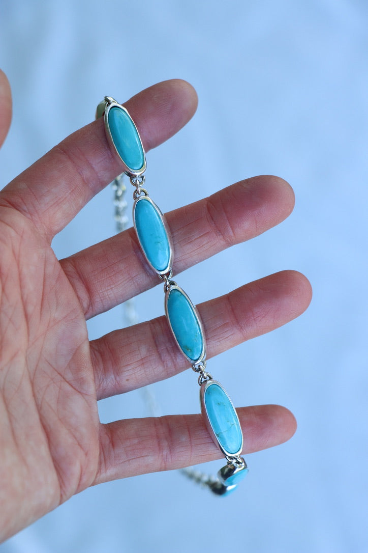 A bold yet timeless choker featuring seven handpicked Kingman turquoise stones, each set in sterling silver and linked to form a fluid, comfortable fit around the neck. Every stone is unique, with natural variation in hue and matrix — making each piece one of a kind. A true statement necklace that layers beautifully or stands strong on its own.