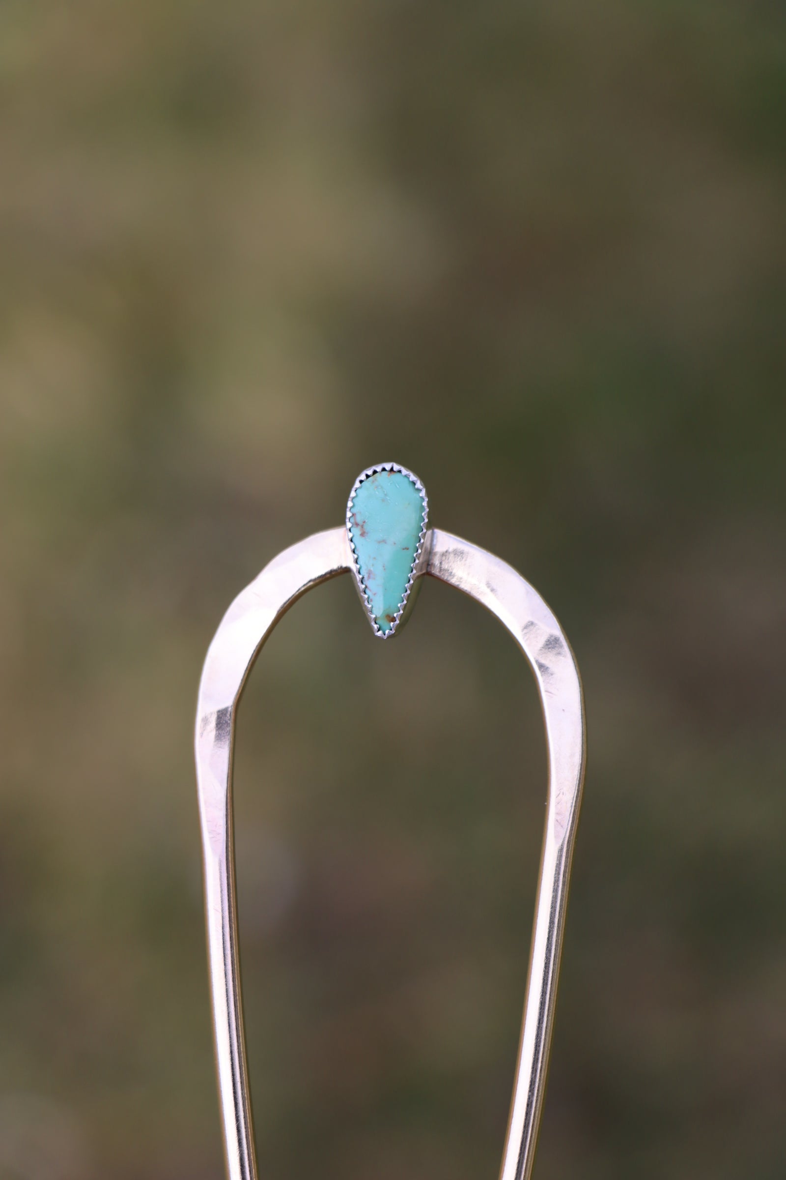 Hand-forged from solid brass, this hair fork is finished with a bezel-set turquoise stone. Designed to secure your hair with ease, each piece balances function and adornment. Simple, sculptural, and made to be worn daily.