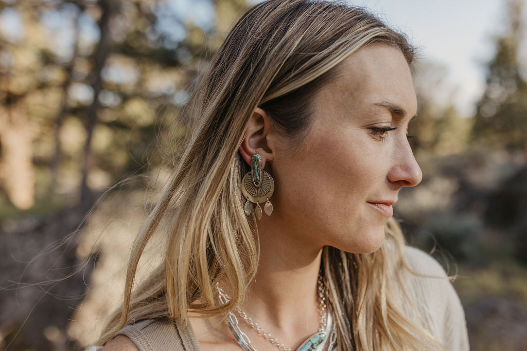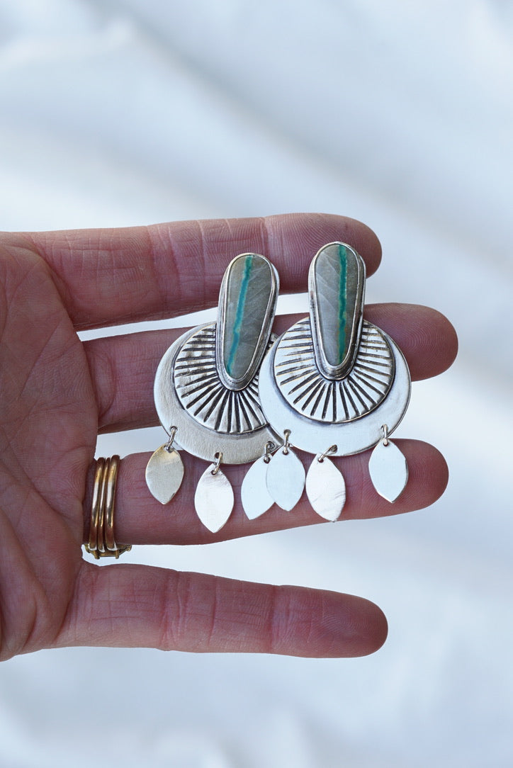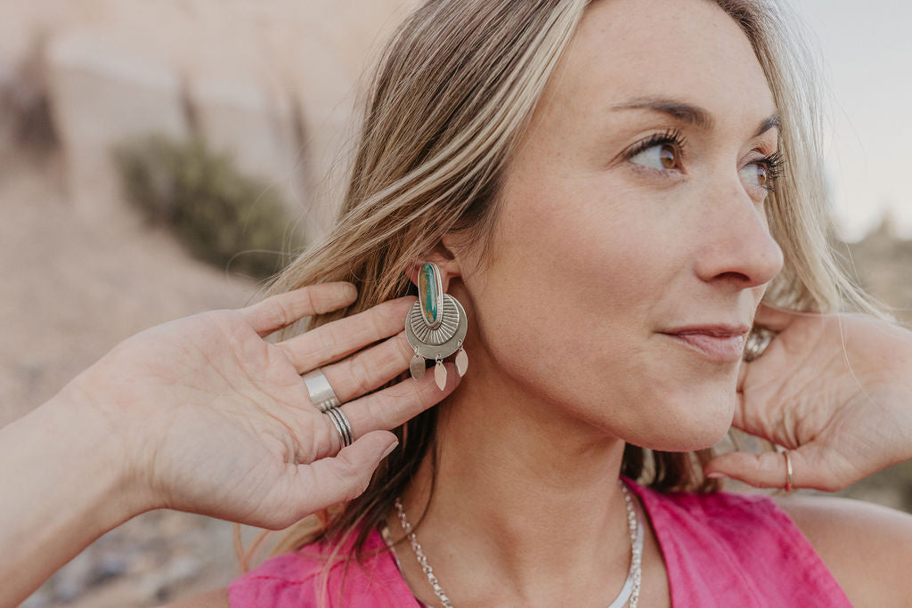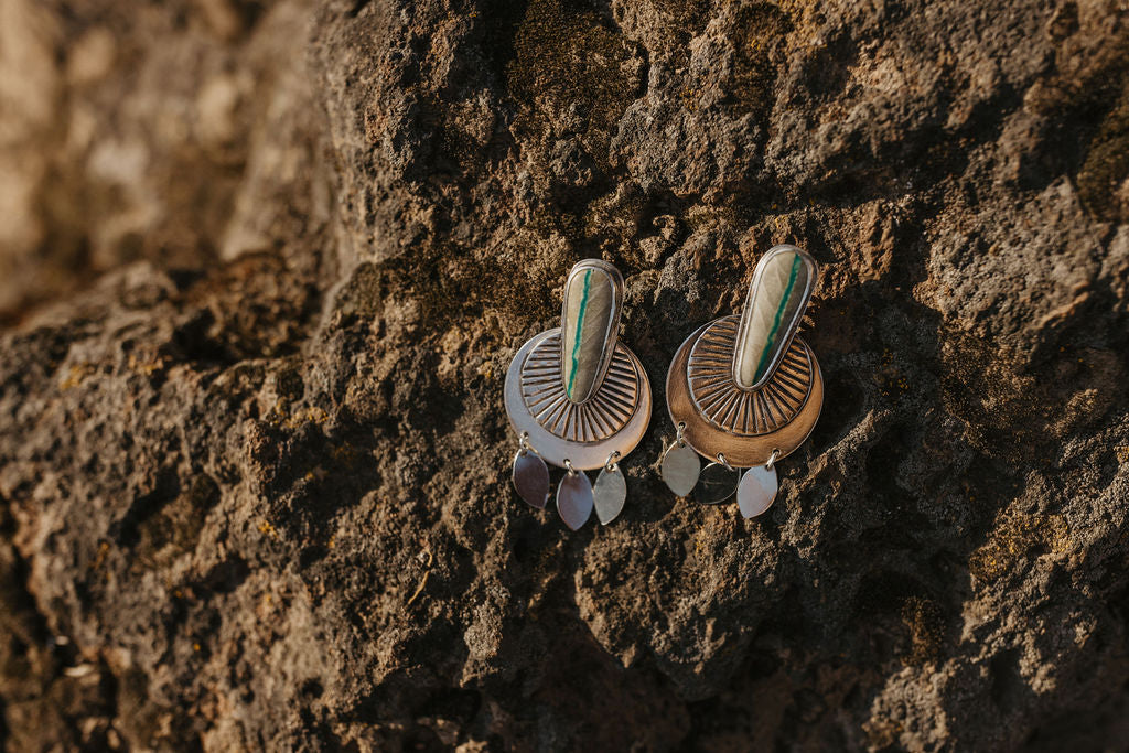 The Wanderer Earrings are made from two sterling silver discs that were carefully sawed out of silver sheet metal. Soldered on top of one another sits a disc that has a simple line pattern. The stones are set to make them the centerpiece of these earrings. Three pieces of sterling silver fringe hang from a single jump ring allowing them to sway in the wind with you. They are made for adventure and built to last.