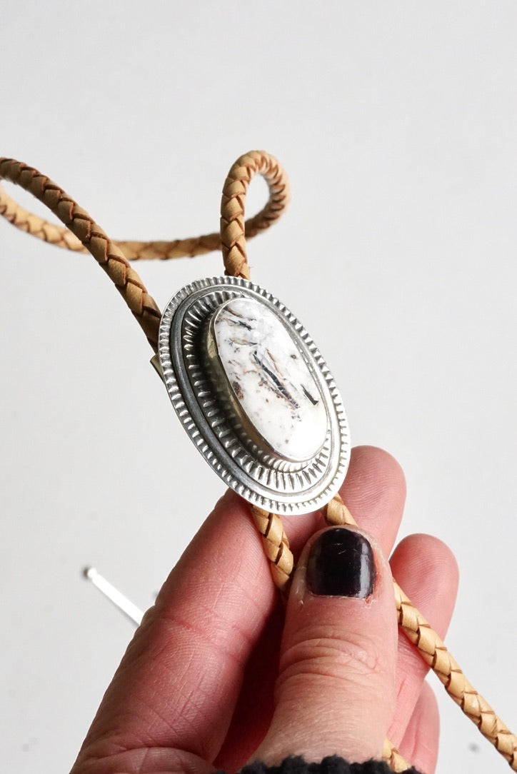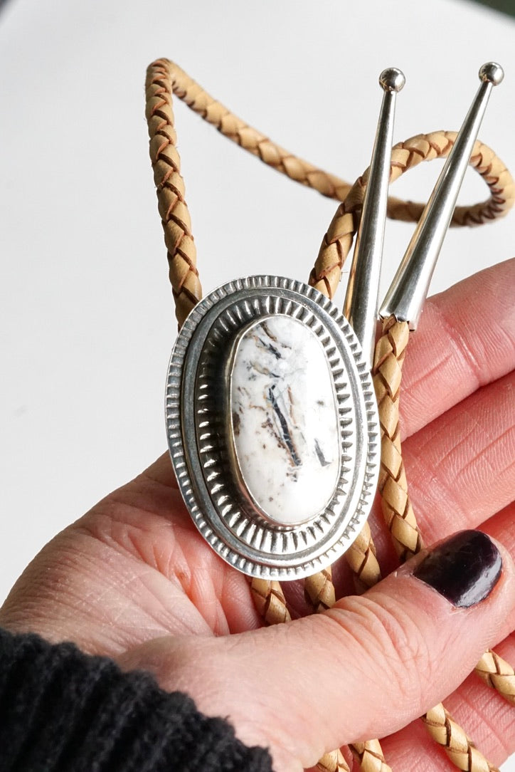 This beautiful Bolo Tie features one high quality White Buffalo stone. The stone is set on three thick layers of sterling silver sheet metal and has a stamped detail throughout.