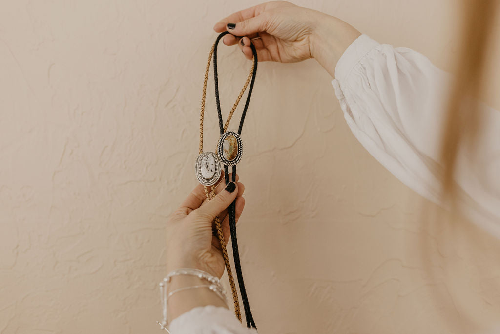 - Tan braided leather cord accompanied by two sterling silver bolo tips.
