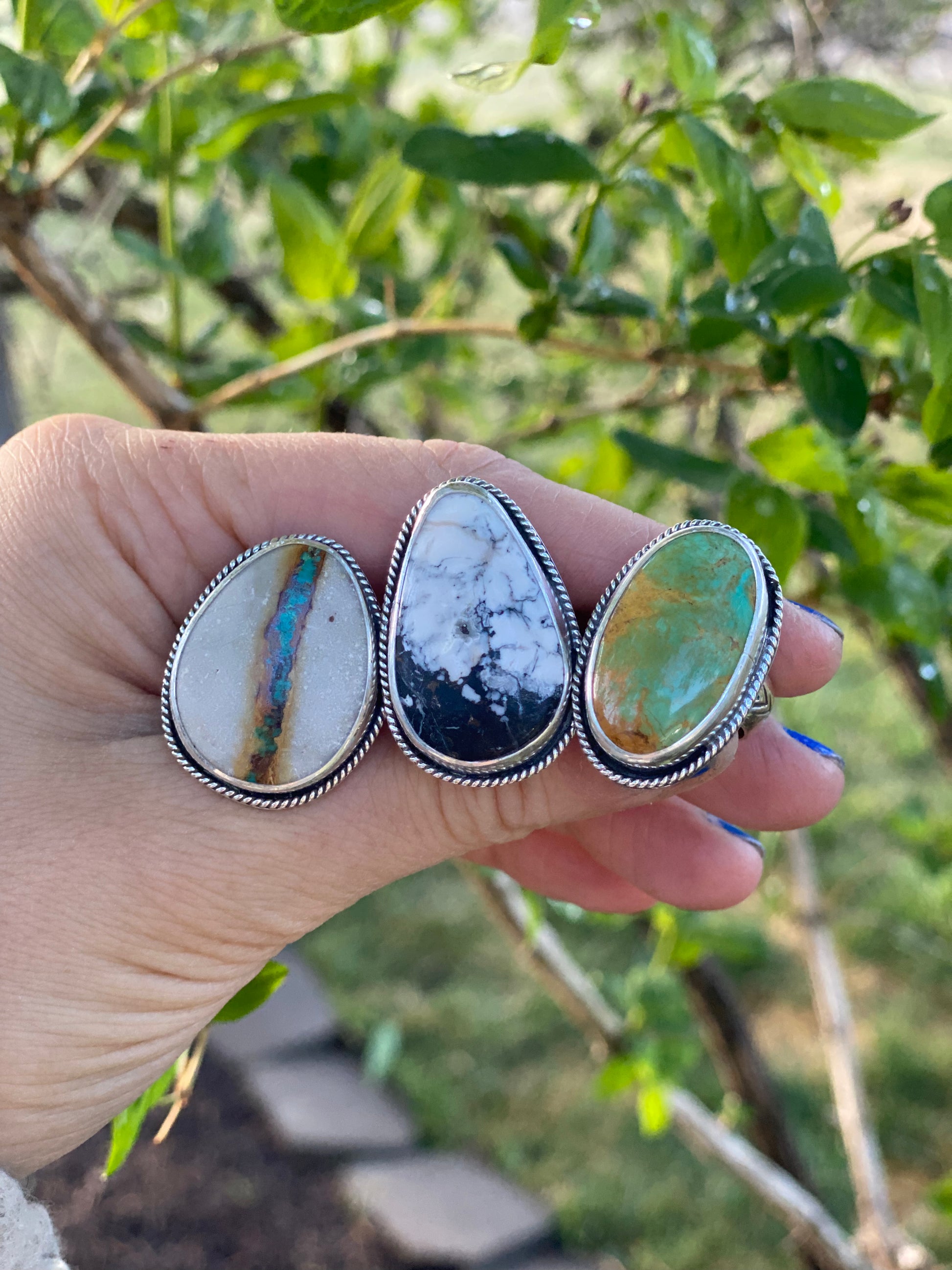 Each ring has a dainty twisted wire surrounding the stone and is set on a thick ring band with a fun stamped pattern.
